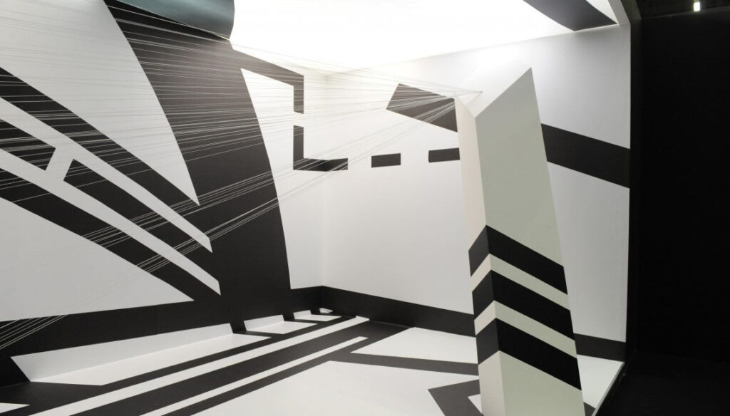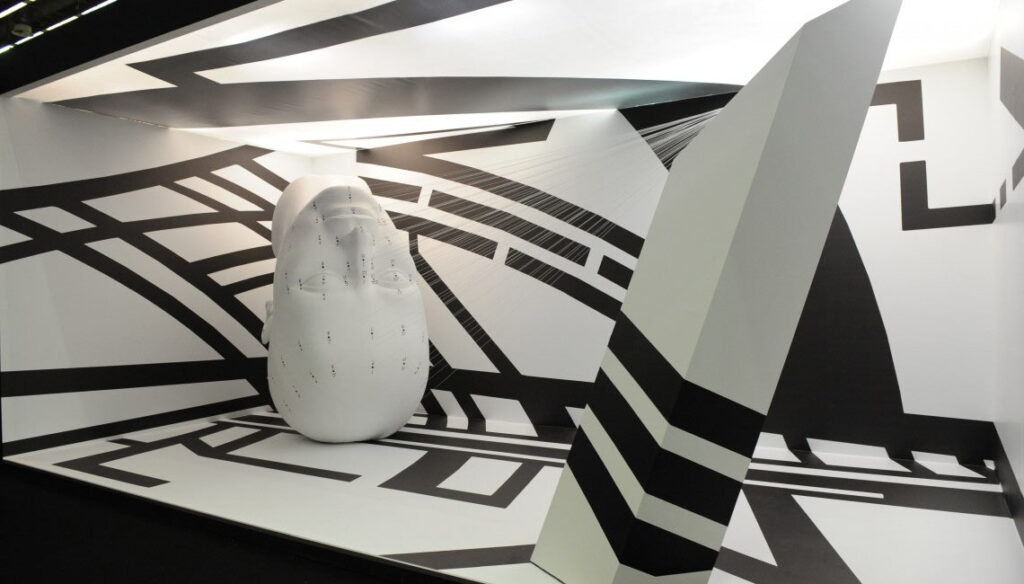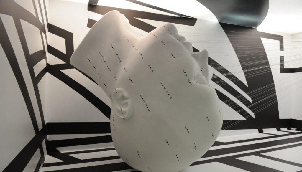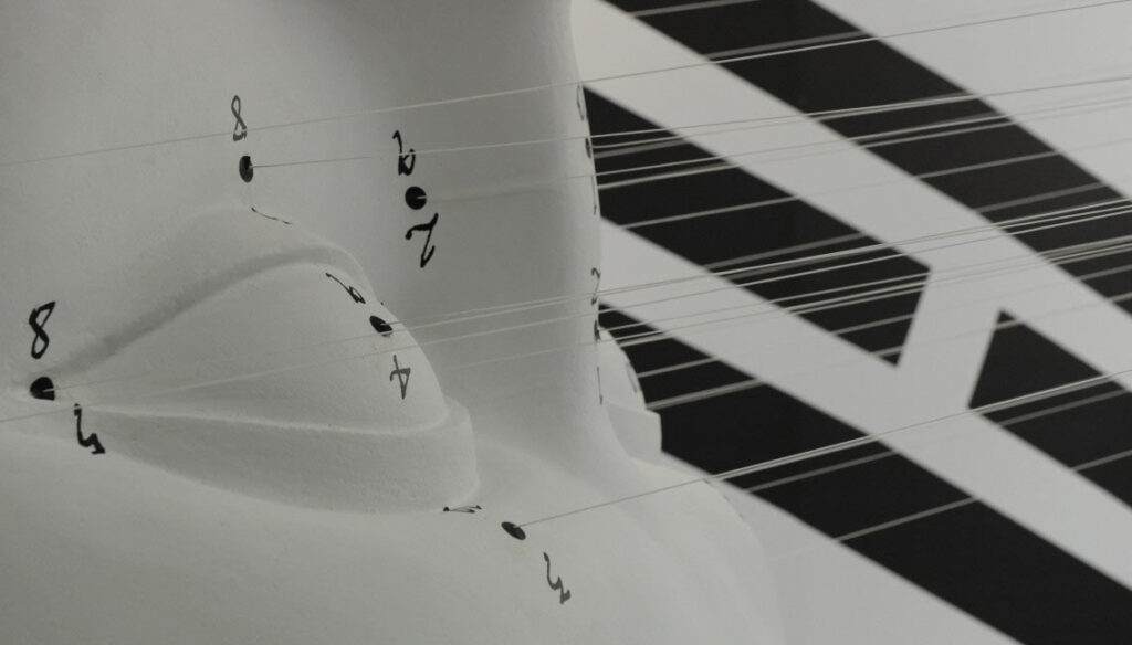 Built as a temporary exhibition for the SAIE construction fair in Bologna, the upside-down head, based on Piero della Francesca’s drawings on mirroring perspective, is the first thing one notices about the Anatomy of Architecture installation. The mysterious sculpture combines Renaissance anatomical research with mathematized perspective and maverick geometries. The installation questions the neutrality of space by situating the uncannily upside-down head along a perspectival axis within a hallucinatory, architectonic space.