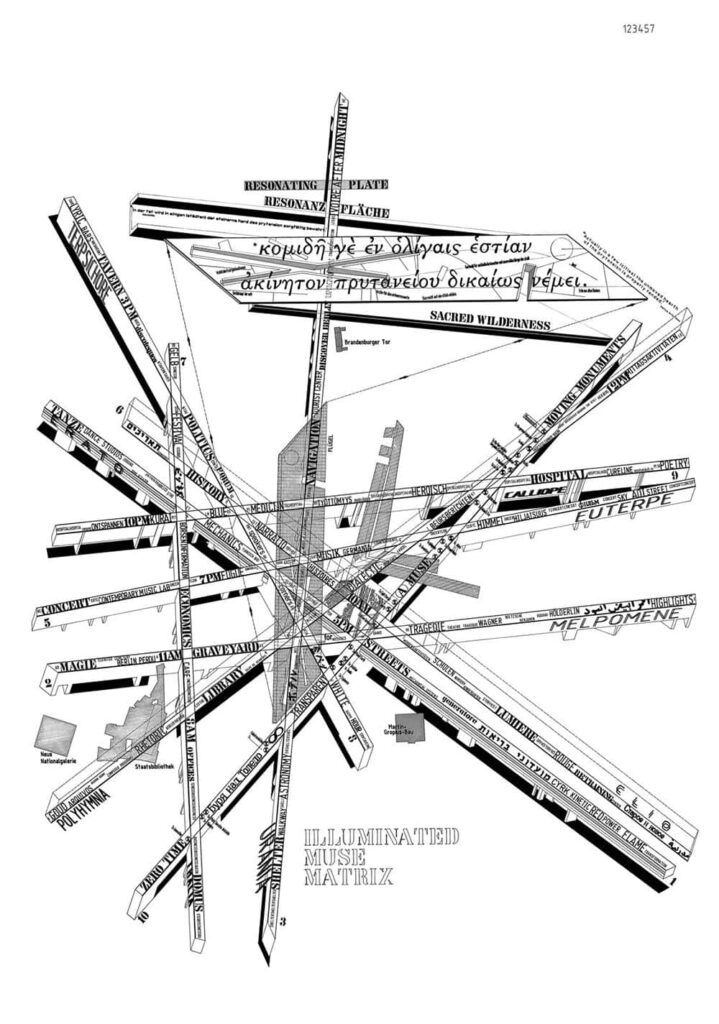Each of the 9 “Muse Lines” represents a cluster of architectonic typologies representing Berlin’s civic history: from the tavern to the graveyard, concert hall, library, hospital, school, shelter, festival, moving monuments, sacred wilderness, etc. that works like a temporal map or spatial clock, demarcating a matrix of historical figures, disciplines, languages, events, colors, shapes and times of the day etched invisibly over the city’s displaced center.