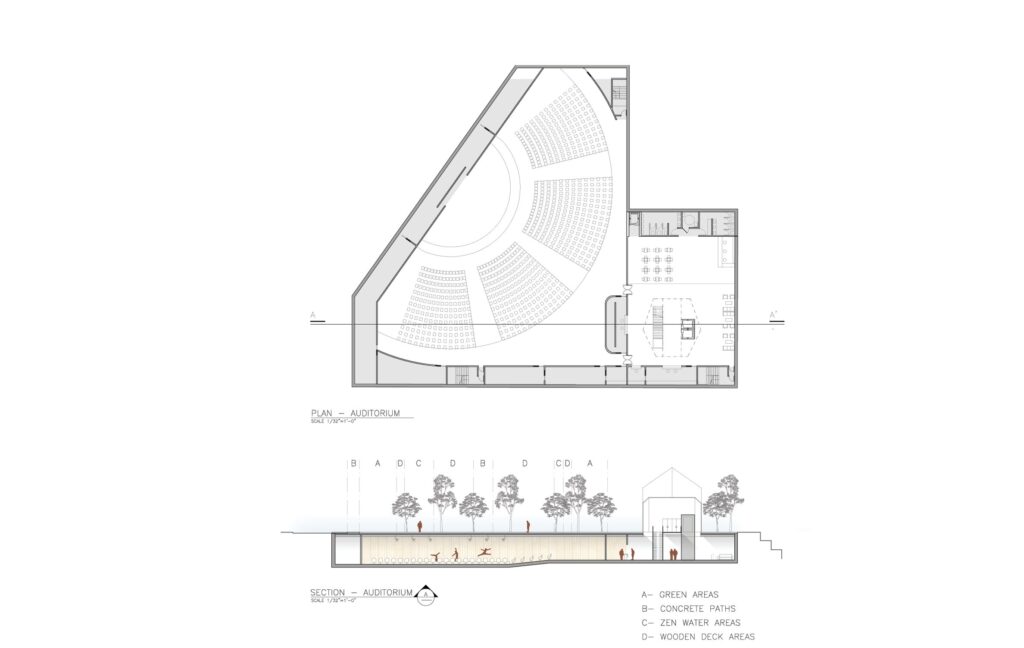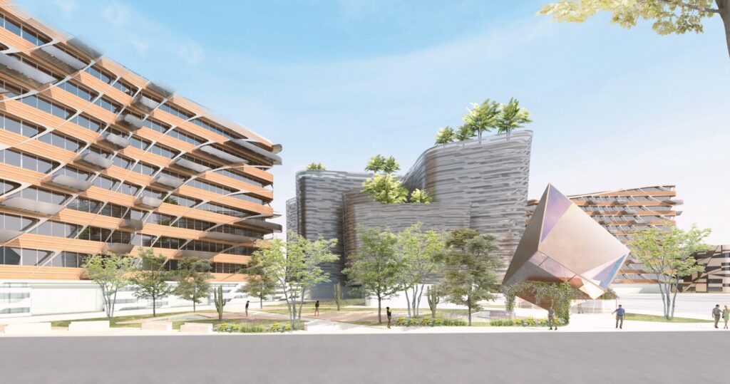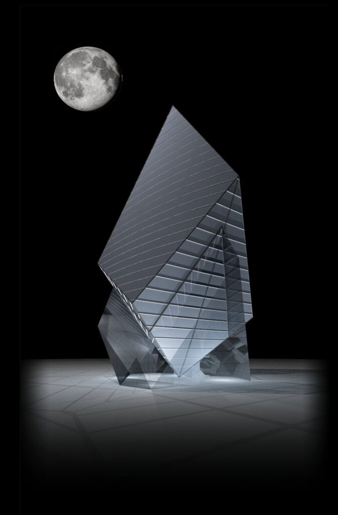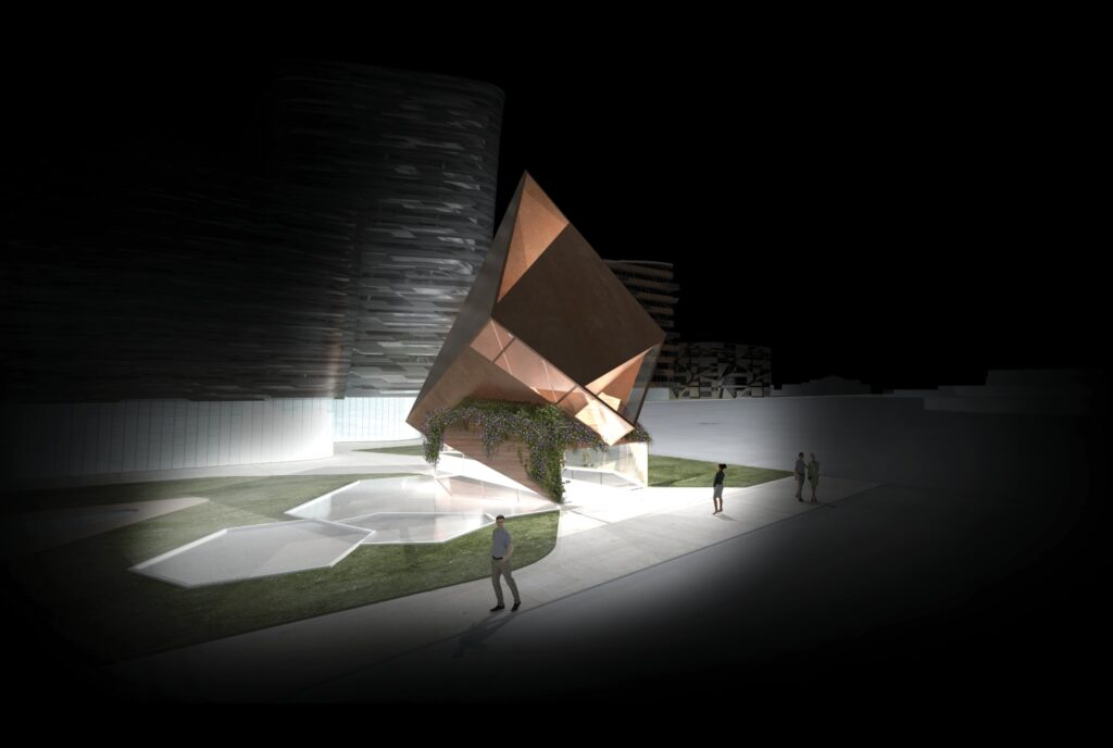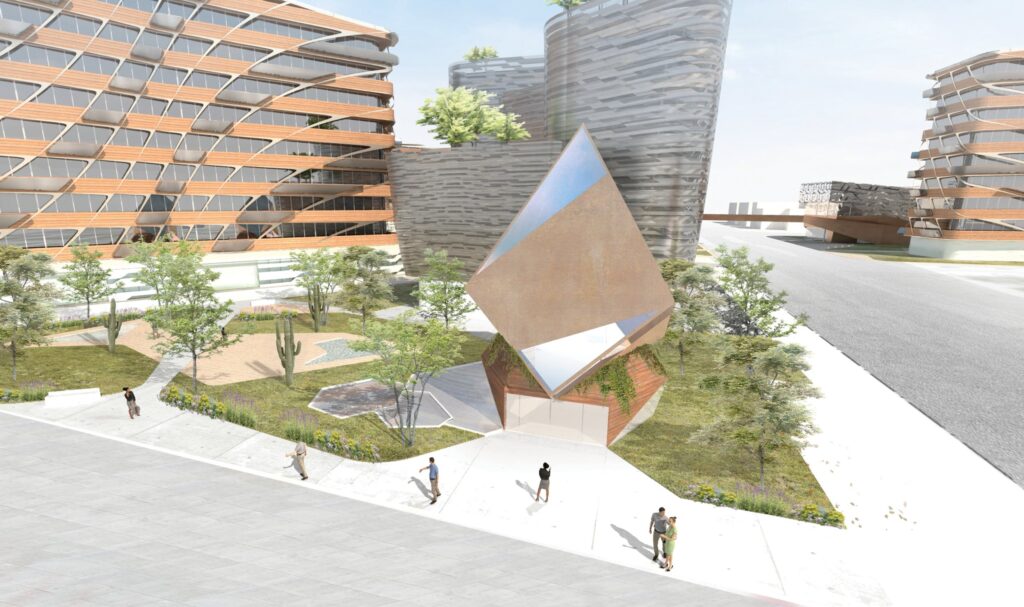 Intended to complement Scottsdale’s lively music scene, the Civic Center Theater rises dramatically like a jagged gemstone at the center of Libeskind’s master plan in downtown Scottsdale. The 22.000 sq. ft venue is designed for musical performances and large congresses with 750 seats in a sound-proofed underground amphitheater, accessible directly from an underground parking garage, and by pedestrian visitors via its gem-shaped lobby above ground. Clad in Arizona’s magnificent native copper and glass, the gem-like lobby stands as a musical and cultural beacon for the new neighborhood rising around it. An “Arizonan zen garden” surrounds the above-ground edifice with local flora and water, an area for rest and contemplation in the heart of Scottsdale’s busy downtown.