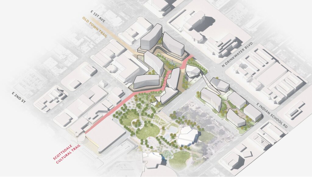 The master plan for Downtown Scottsdale, the location of the ex-Saguaro Hotel between Indian School Rd. and Civic Center park, consists of a built-up area of over 950.000 sq. ft on two plots with a total of 230.000 sq. ft of surface area, connected by a pedestrian bridge over Drinkwater Blvd. The master plan is conceived with a grand public plaza at its center, bringing together two interweaving pedestrian footpaths—the Old Town Trail and the Scottsdale Trail—creating a Blue Zone at the heart of Scottsdale. These two Trails winding through the master plan—inspired by the old western trails across Arizona that unified the country—are designed to be lined with large public sculptures commissioned by the developer and donated to the City of Scottsdale, creating an unmissable attraction for tourists and residents alike.