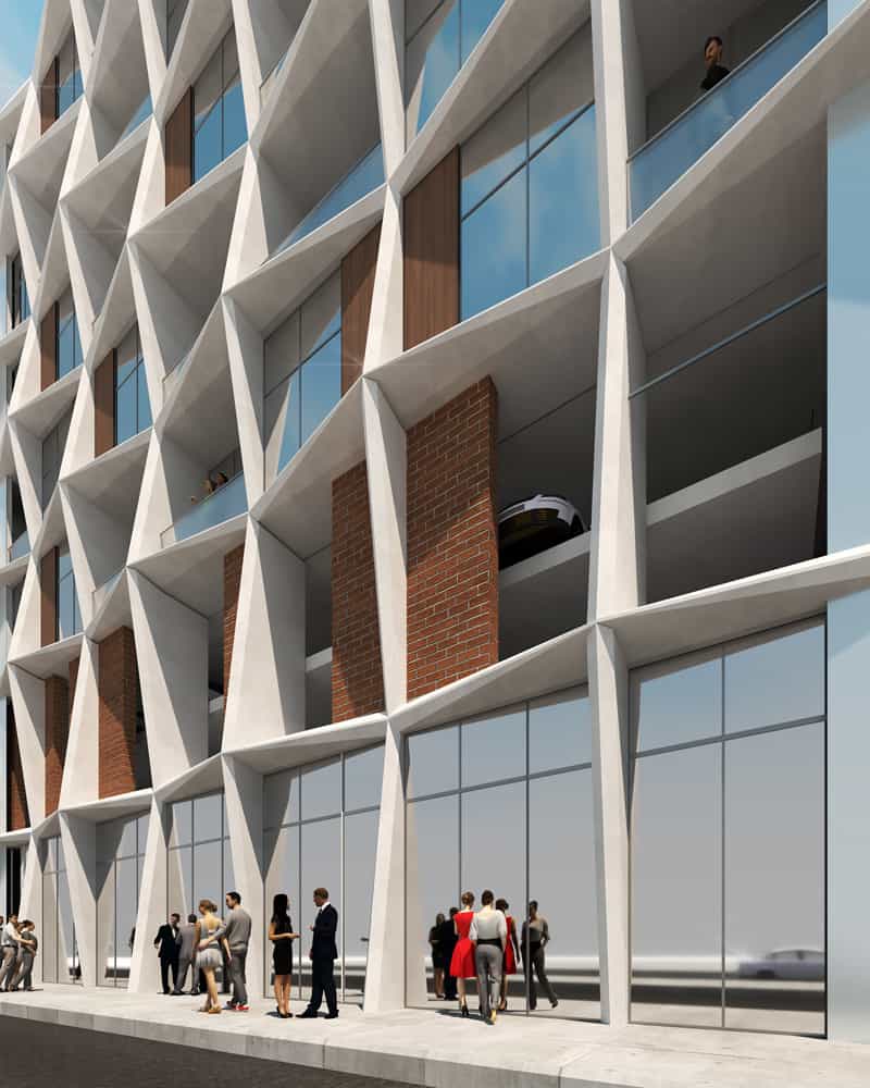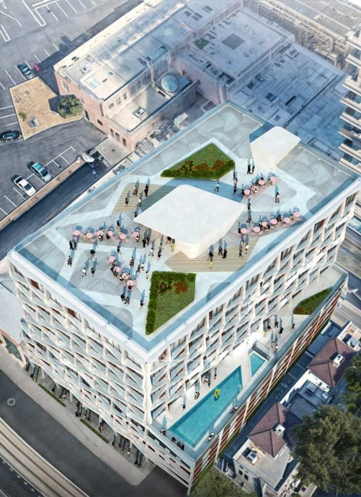 Located in the Roosevelt Row Art District of Phoenix, Arizona, the building project Manzana is designed to engage in a dialogue with its unique neighborhood. Spanning 104,987 sq ft and rising to a height of 83 ft, the 8-story architectural composition blends the rustic elegance of a historic hardware store’s brick façade, traditional Mexican wood, and pays homage to the mid-century architects for whom the valley is known.