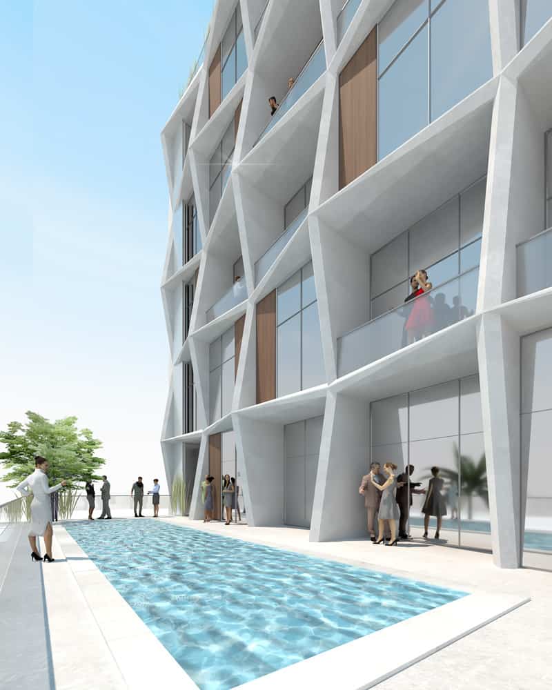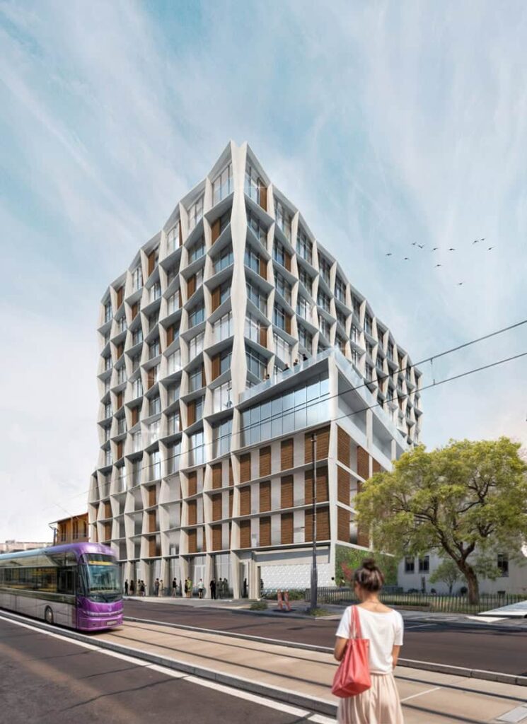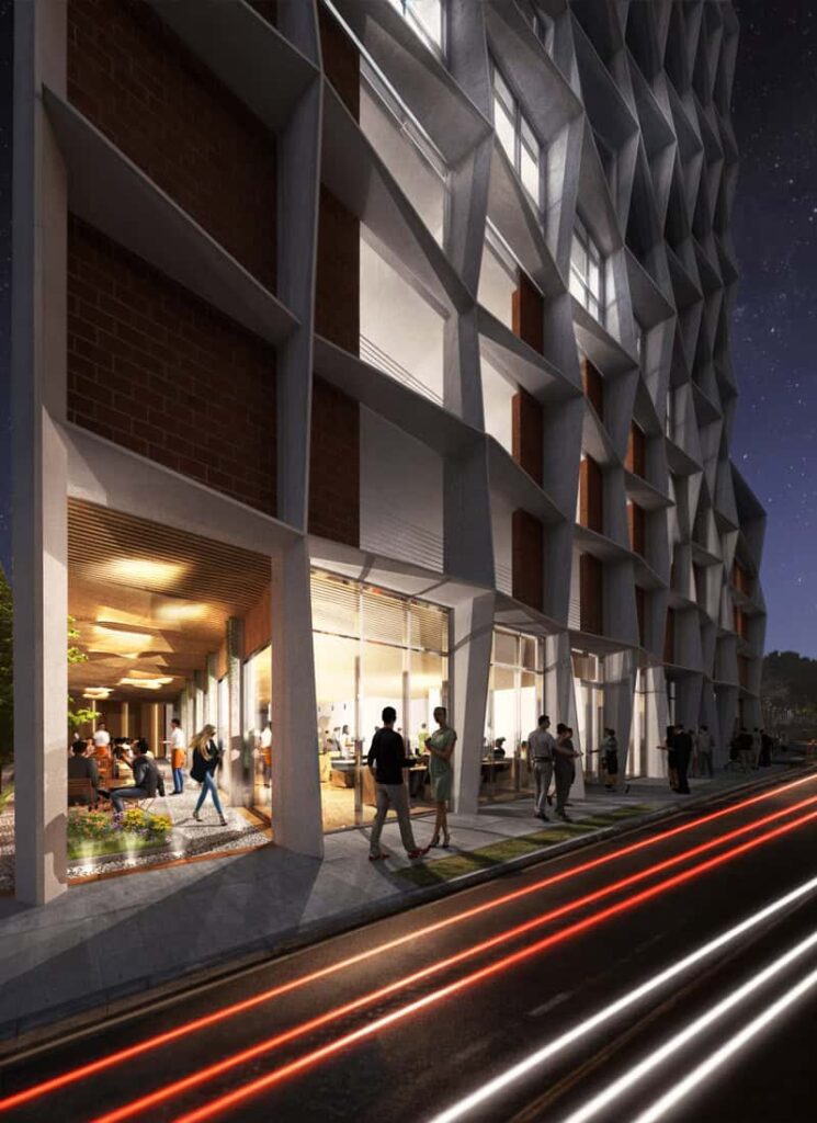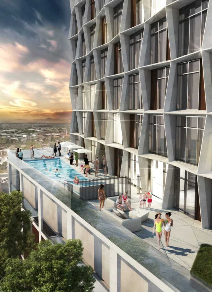 Intersecting with its brick podium, Manzana’s undulating façade reimagines the classical grid and pays homage to the artistic essence of its surroundings. The one-of-a-kind façade design moves rhythmically in a dance of angular geometries and local materials, aiming to harmonize with urban history and contribute to a revitalized downtown. With its sharp, modern lines and intricate design elements, the building encapsulates the thrilling resurgence of Phoenix’s downtown landscape, establishing itself as an urban beacon for future recreation and innovative architecture.