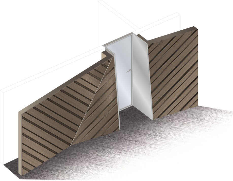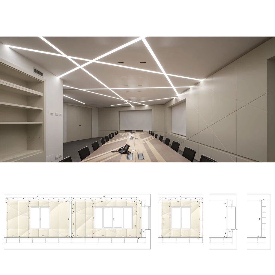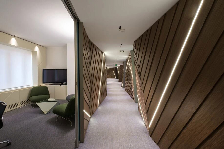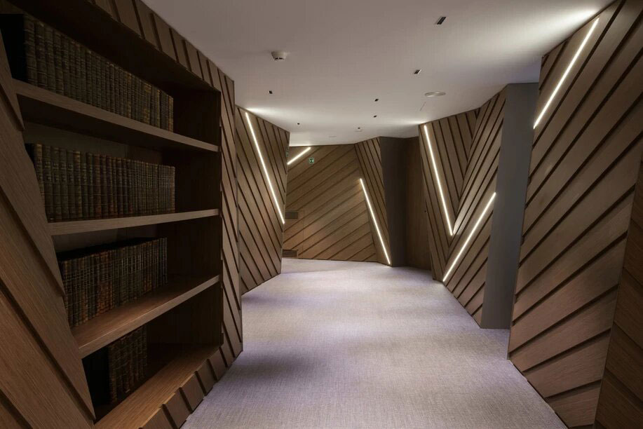 The design utilizes a sequence of spatial compressions created out of inclined wood paneling with cove LED lighting along the edges, further emphasizing the design’s avant-garde geometry. At the same time, a series of elegant, contemporary meeting rooms behind the main corridor provide ideal places for hammering out a brief or taking a deposition.