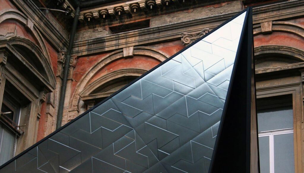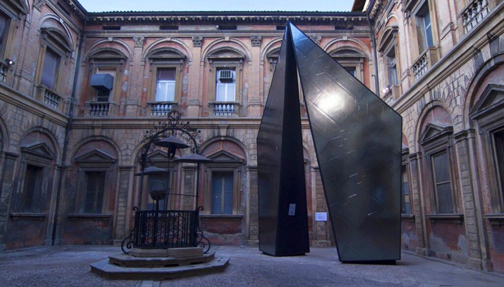 Created for the 2013 Water Design of Bologna festival, the 26-foot installation consists of two imposing facades made of metalized-porcelain ceramic panels explicitly fabricated for this project by well-known Italian manufacturer Casalgrande Padana. Two trapezoidal façade with high safety performance standards converge to form a pinnacle serving as a dramatic gate to the entrance to the Children’s Hospital of Bologna.