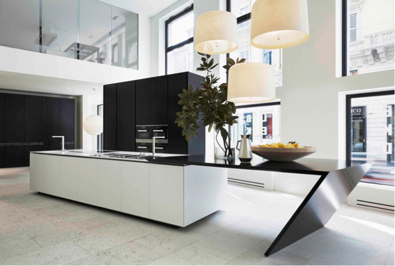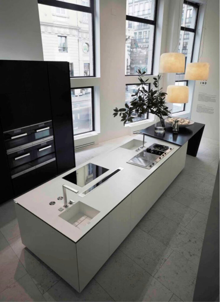 The Sharp Kitchen combines the ideal setting for both food prep and socializing, which are such undeniable elements of the modern kitchen. The design is aesthetically refined while maintaining attention to detail in a space that demands practicality. Its DuPont Corian surfaces with diagonal “sharp” edges are sleek and vitreous. At the same time, the appliances are top-of-the-line Miele intended to create a piece of “kitchen art” without sacrificing functionality.