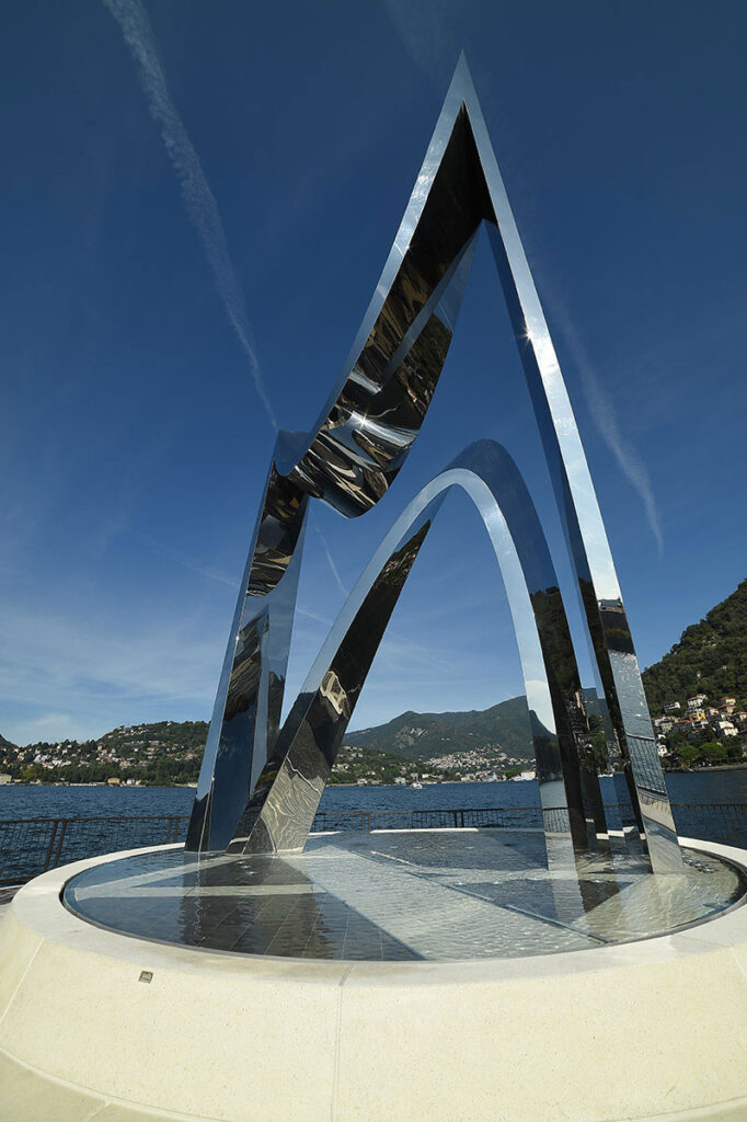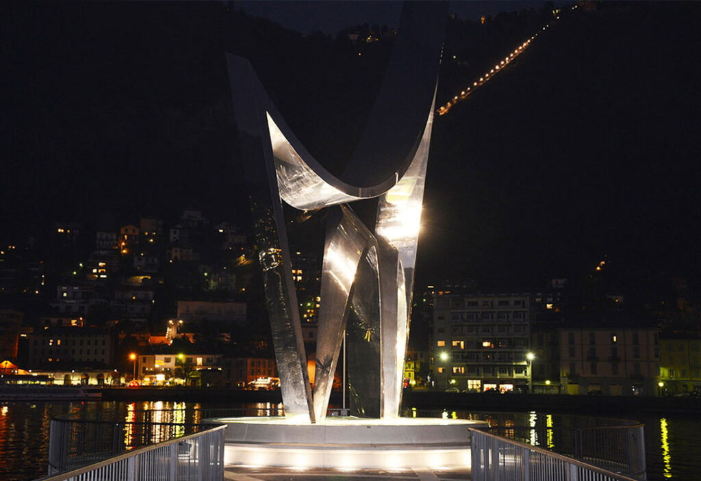 The two steel sinusoidal waves reciprocate their curvatures, and the poles bend away from the perpendicular, creating seemingly infinite reflections of the city, mountains, and the Lake of Como itself. The structure is illuminated at night by an underwater LED lighting system that plays off the reflective steel much as the sun does during the day.