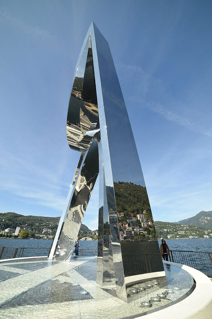 The design of this sculpture, dedicated to the physicist and son of Como, Alessandro Volta, was a gift to the city of Como by the Libeskinds. Located at the end of the Diga Foranea pier at the center of Como’s harbor, it stands over 45 feet in height and is made of calendared steel coated with 316 thin, reflective steel panels. The sculpture’s curvatures are intended to pay homage to Volta’s discovery of the electric battery, with its positive and negative charges flowing through it.
