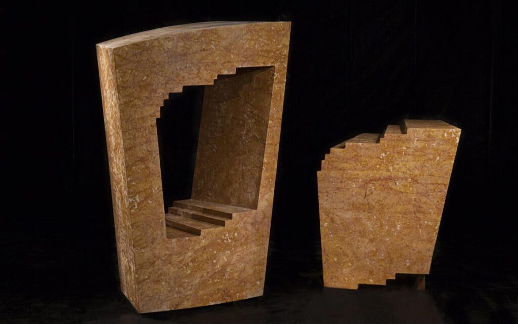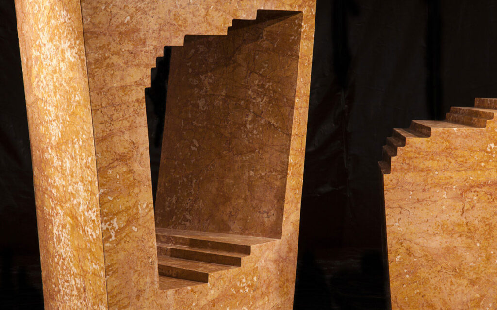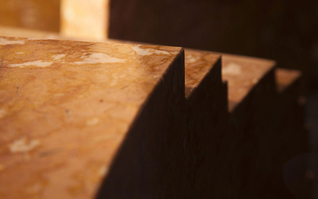 Through the disjuncture between positive and negative spaces, The Wedge stands as an homage to the tradition of Italian sculpture, which challenges the weight and solidity of marble with the malleability of pure form. The question is presented via the dichotomy of two pieces of Arancio di Selva marble sourced from a single block from the world-famous Margraf quarries in Northern Italy.