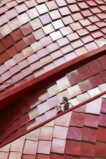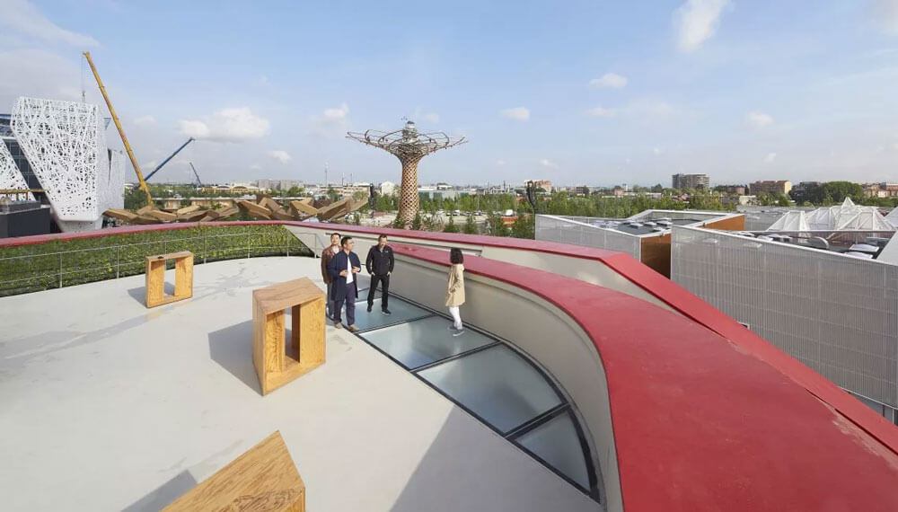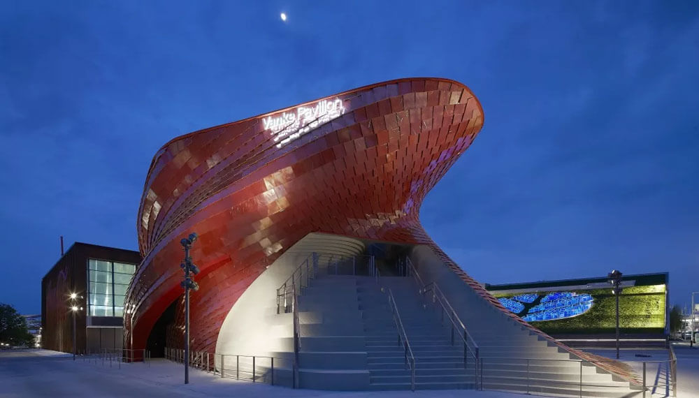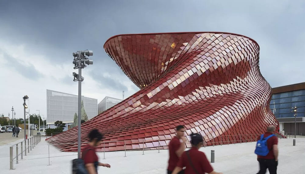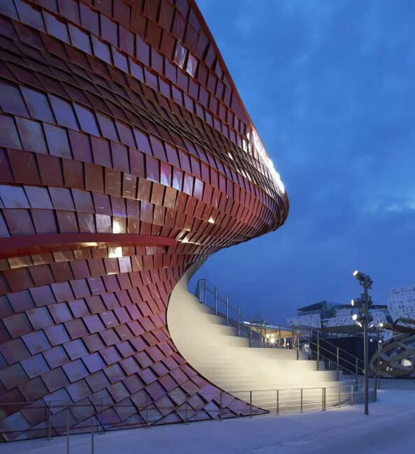 Built for China Vanke at the 2015 Milan Expo, the Vanke Pavilion is ground-breaking in both construction and appearance. The scaly façade, manufactured by Casalgrande Padana, further accentuates the serpentine lines that define it, making its Chinese dragon-inspired nature even more apparent. A twisting motion creates a fluid circulation from the exterior into the exhibition area, providing visitors access to the rooftop terrace, which offers panoramic views of the entire Milan Expo Park.